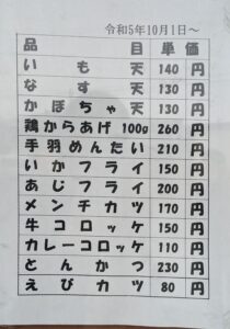 入店すると、カウンターがあり注文を受け付ける。注文を受けるスタッフの女性と芋天ぷらをはじめとした天ぷらを揚げている方が後方にいる。