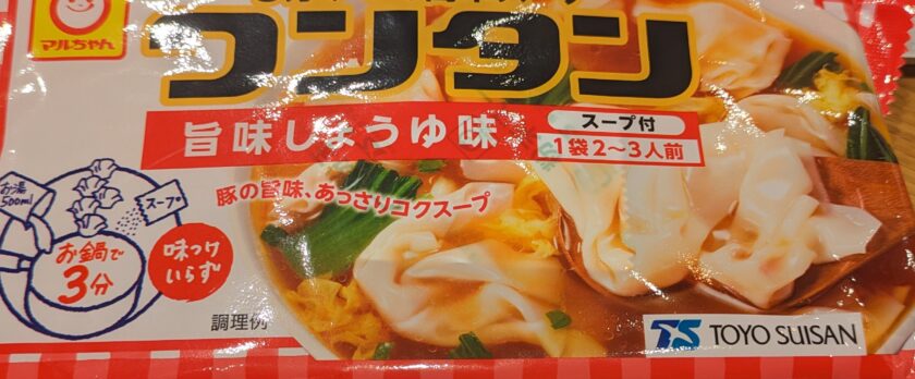 東洋水産㈱のマルちゃん「ワンタン」は、美味しいのでよく食べる。3分お鍋で煮るだけで簡単にできる。野菜等をいれても美味しい。