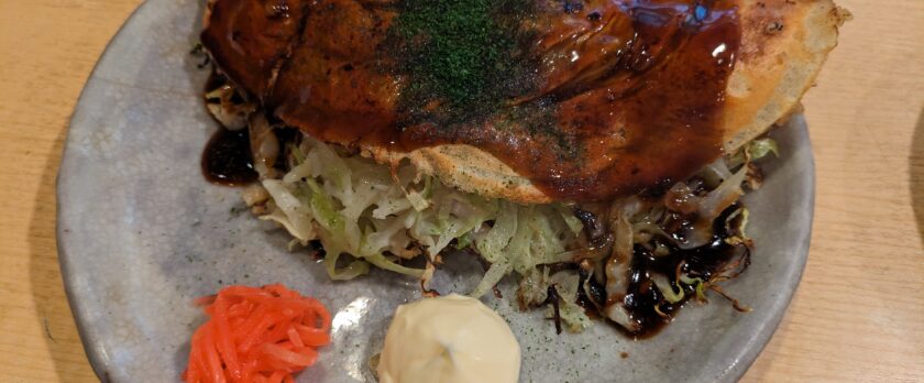 わたしは、肉入りの平焼を注文。表の生地は薄く、クレープみたいだが、見た目とは違いお箸では簡単には切れないほどの弾力がある。 美味しい。なかなかお好み焼きの美味しいお店には出会わないが、ここ都一はグッド。
