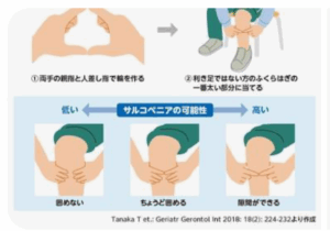 このサルコペニアのリスクを簡単にチェックする方法として 指輪っかテストという ①両手の親指と人差し指で輪っかを作る ②利き足でない方のふくらはぎの最も太い部分に当てる