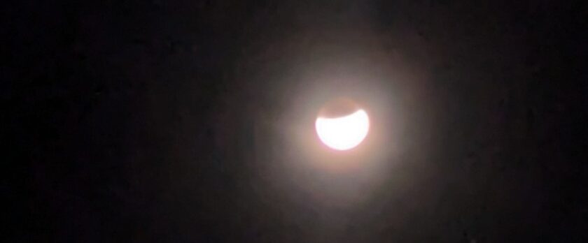 皆既月食 見た 午前2時半 食の始まり 左下に月が 爪のかけらみたいに小さく光り 右側がオレンジ色になりかけたあたりで雲があらわれる
