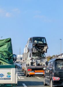 こんな積み方していいのだろうか ワイヤーも心もとなく 廃車が揺れる ネットで簡単にしらべると 小型 大型 など トラックのサイズで 積載できる高さがことなるようだが 最大で 3メートル 程度のようだ 近づかない 後方やサイドは 特に注意だ